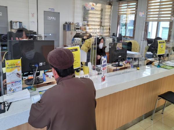 민원창구는 많은 사람들이 이용하는 다중이용 시설로 민원인과 밀접한 거리에서 대면 업무를 보기 때문에 바이러스 감염이 항상 우려되는 곳이다.이에 따라 방문 민원인과 창구 담당자의 직접 접촉을 최소화해 감염 확산을 예방하고자 높이 90㎝의 투명 가림막을 설치하였으며, 가림막 내 공간을 만들어 서류접수에 불편함이 최소화되도록 하였다.