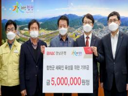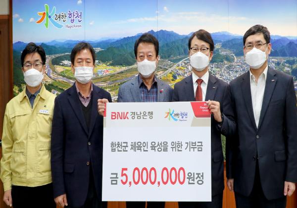 합천군수실에서 열린 기탁금 전달식에는 문준희 합천군수, 고영준 경남은행 서부영업본부 상무, 김재년 경남은행 합천지점장 등 관계자 6명이 참석했다.