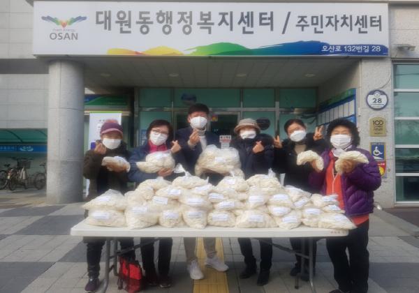 오산시 대원동행정행정복지센터(동장 강래출)는 지난 11일 대원동 새마을부녀회(회장 이서진)가 연말연시를 맞아 관내 어려운 이웃을 위해 사랑의 떡국떡 50kg을 기탁했다고 밝혔다.