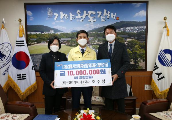 ㈜신영티아이 조주상 대표는 “김해의 미래를 책임질 지역인재들이 꿈과 희망을 이루는데 소중한 디딤돌이 되었으면 하는 마음에 기탁하게 되었다”고 소감을 전했다.