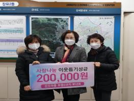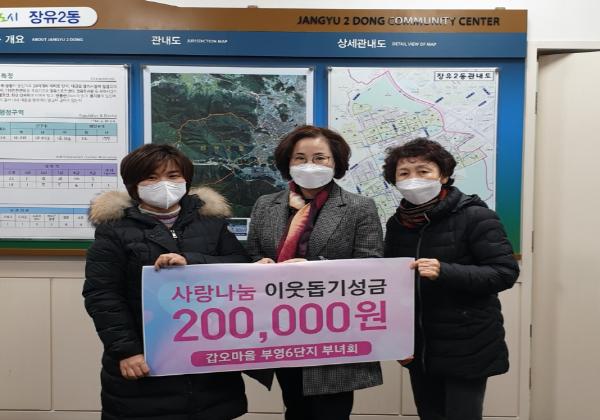 김해시 장유2동 갑오부영6단지 아파트 부녀회(회장 안해영)에서 12월 14일 장유2동 행정복지센터를 방문하여 어려운 이웃을 위해 사용해 달라며 현금 20만원을 기탁하였다.