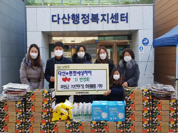 남양주시 다산행정복지센터(센터장 김진현)는 다산e편한세상자이아파트‘S1번영회’(회장 조경아)에서 지난 14일 다산1동 취약계층을 위한 후원금 70만원 및 각종 후원물품을 서부희망케어센터에 지정 기탁했다고 밝혔다.