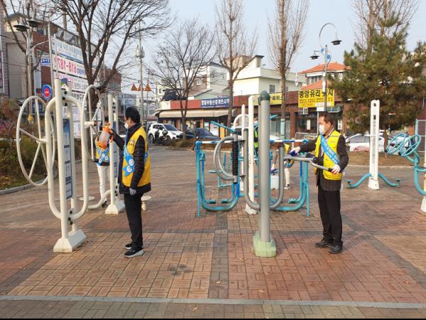 평소 시민들이 자주 이용하는 버스승강장 및 체육공원 내 운동시설을 대상으로 꼼꼼하게 방역을 실시했다.