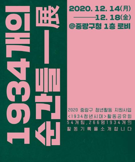 이번 ‘1934개의 순간들-展’은 ‘1934 청년시대’에 참여한 팀들의 활동기록을 전시하는 자리로, ▲‘모여라 배우자 원데이쌀롱’의 공예작품, ▲27살 중랑구에 거주하는 4명의 친구로 구성된 ‘27.4 포토에세이’의 이야기를 담은 사진, ▲온라인 글쓰기 모임 ‘쓰담’의 글 모음집 등 활동 영상과 사진, 공예작품 9점, 책자 6점, 회화 2점을 전시 중에 있다.