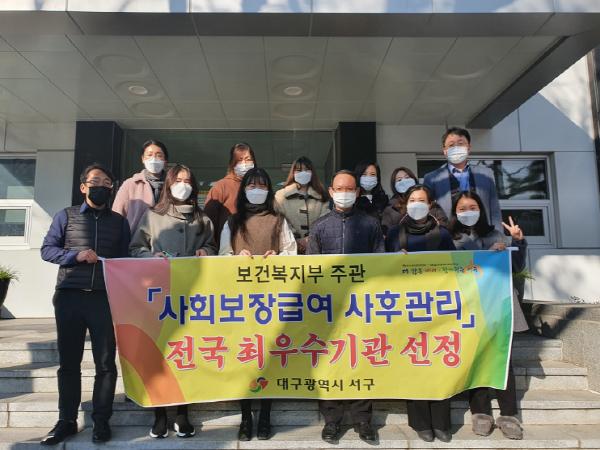 대구 서구는 보건복지부 주관 ‘2020년 지역복지사업 사회보장급여 사후관리분야 평가’에서 최우수기관으로 선정되어 작년에 우수기관 선정에 이어 2년 연속 수상을 하였다.