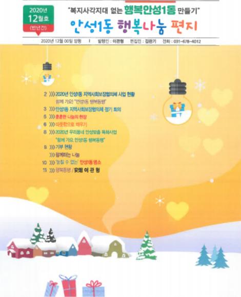 안성시 안성1동 지역사회보장협의체에서는 행복한 안성1동을 만들기 위해 노력하는 위원들과 여러 나눔 사랑을 주는 후원자들에게 감사의 뜻을 전하기 위해 『안성1동 행복나눔 편지』2020년 12월호(반년간)를 발행했다고 밝혔다.