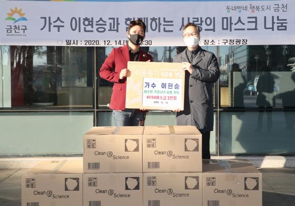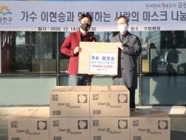 금천구는 12월 14일 가수 이현승이 팬카페(동반자)회원들과 함께 지역 취약계층을 위해 KF94마스크 3,000장을 전달했다고 밝혔다.