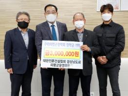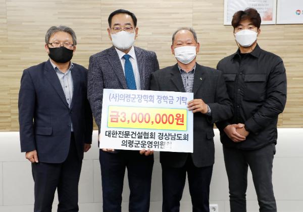 대한전문건설협회 경상남도회 의령군운영위원회(위원장 김경도)는 14일 지역인재 육성을 위해 써 달라며 (사)의령군장학회(이사장 백삼종)에 장학금 300만원을 기탁했다.