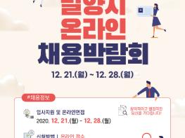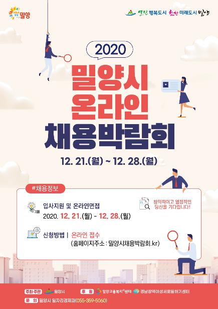 밀양시는 12월 21일부터 28일까지 8일간 ‘온라인 채용박람회’를 개최한다고 밝혔다. 이번 채용박람회는 코로나19 감염확산 방지를 위해 전면 온라인 방식으로 진행된다.