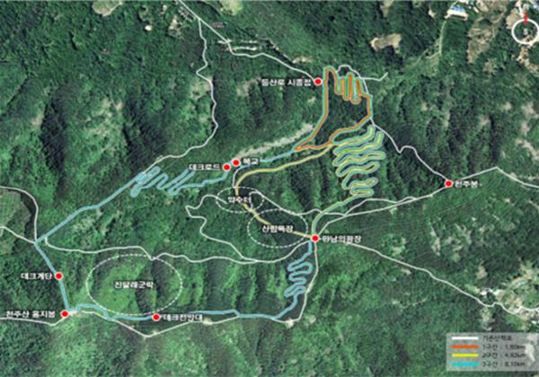 이번에 조성된 천주산 누리길은 남녀노소 누구나 쉽고 편리하게 산행을 즐길 수 있도록 노선을 가능한 완만하게 조성하여 평소 천주산 주 등산로인 임도를 이용하는 산행객의 불편사항(임도 내 차량 통행으로 산행 만족도 낮음)이 해소될 수 있도록 계획하여 추진하였다.