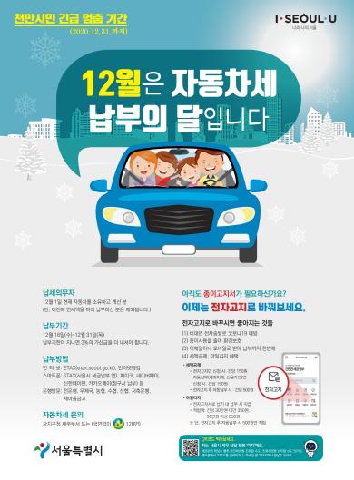 유미정 송파구 자동차세팀장은 “간편하고 다양한 납부 방식으로 주민들의 납세편의를 돕겠다”면서, “체납 시 가산금은 물론 자동차번호판 영치 등 불이익이 발생하는 만큼 기한 내 납부를 당부드린다”고 전했다.