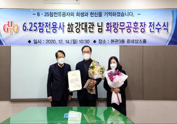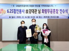 구청 르네상스홀에서 개최된 이날 전수식에는 이성 구청장이 직접 참석해 고 강대관 하사의 차남 강병용 씨에게 훈장, 훈장증, 감사패를 수여했다. 국방부도 국방부장관의 서한문을 전달했다.