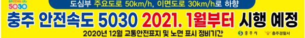 충주시와 충주경찰서는 보행자 교통사고 감소를 위해 도심부 차량 제한속도를 하향하는 ‘안전속도 5030’정책을 올해 12월까지 교통안전표지 및 노면표지 정비 완료 후 내년 1월부터 본격 시행할 예정이라고 14일 밝혔다.