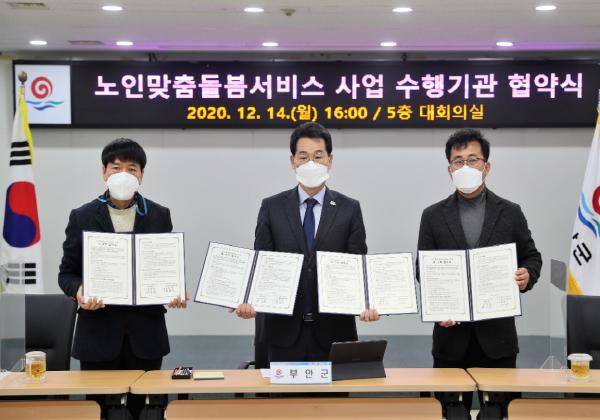부안군은 지난 14일 사회복지법인 기독교대한감리회 사회복지재단(부안노인복지센터) 및 사회복지법인 한기장복지재단(부안종합사회복지관)과 노인맞춤돌봄서비스사업 수행기관 협약을 체결했다.