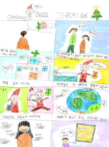 산타할아버지가 선물을 전달하는 과정에서 산타를 비롯한 온 지구인이 확진자가 되지 않지 않을까 하는 우려와 크리스마스 전까지는 코로나가 사라져 스마트폰 선물을 받고 싶다는 귀여운 소망을 그림에 담은 것이다.