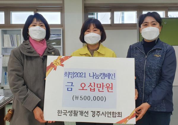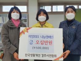 한국생활개선경주시연합회는 지난 11일 경주시농업기술센터를 방문해 희망2021 나눔캠페인 성금 50만원과 경주시장학회 성금 100만원을 전달했다.