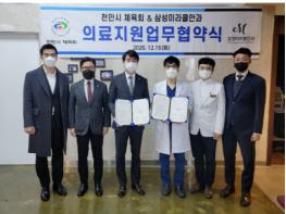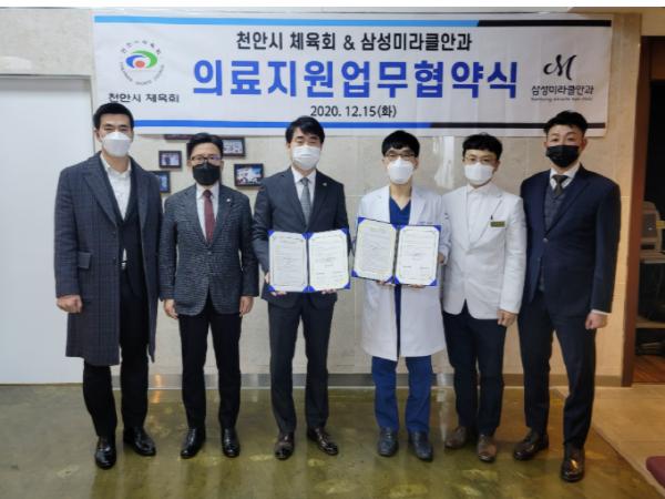 천안시체육회와 삼성미라클안과가 15일 오후 삼성미라클안과에서 상호 교류 및 협력 강화를 위한 업무협약을 체결했다.