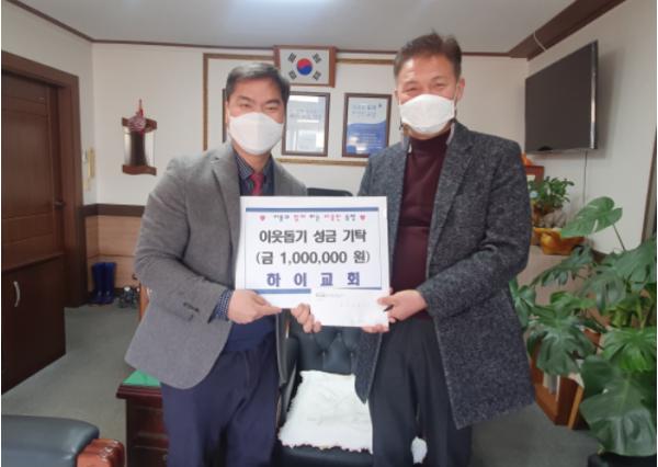 고성군 하이교회는 12월 15일 오전 하이면사무소를 방문해 이웃돕기 성금 100만 원을 기탁했다.