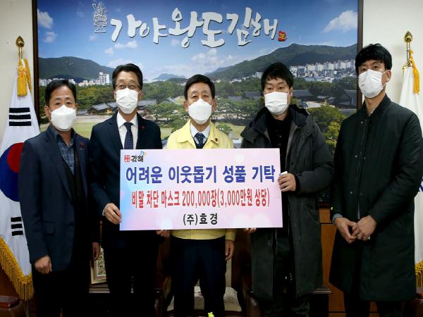 ㈜효경(대표이사 신동훈)에서 지난 15일 김해시를 방문해 관내 어려운 이웃과 보훈단체를 위해 비말 차단 마스크 20만장(3천만원 상당)을 김해시에 기탁하며 따뜻한 마음을 보탰다.