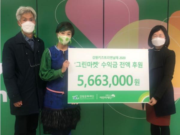 (재)강원문화재단 강원국제예술제 운영실은 15일 오전 9시 강원문화재단 회의실에서 초록우산 어린이재단 강원지역본부와 함께 강원키즈트리엔날레2020 그린마켓 운영 수익금 전달식을 가졌다.