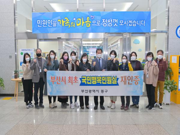 부산광역시 동구는 행정안전부가 주관하는 2020년도 국민행복민원실에 부산시 최초로 재인증 기관으로 선정됐다.