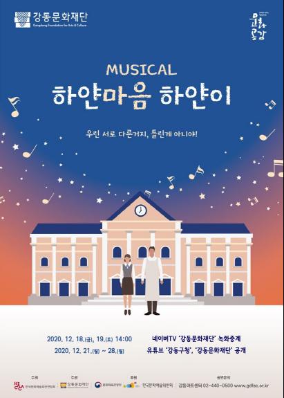 강동구 강동문화재단은 뮤지컬 ‘하얀마음 하얀이’를 온라인 중계 공연으로 개최한다. 오는 12월 18일과 19일 오후 2시에 강동문화재단 네이버TV에서 관람할 수 있다.