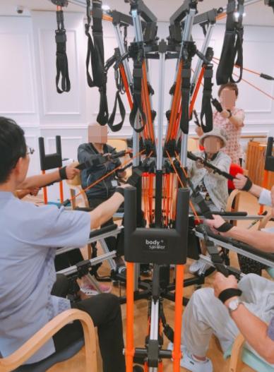 바디스파이더는 고무로프의 탄성을 이용한 저항성 운동으로 어르신들의 근력, 보행, 균형 능력과 뇌활동을 활성화시켜 치매예방에 도움을 주는 전신 운동기구이다.