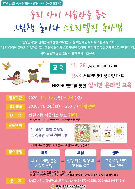 음성군어린이급식관리지원센터는 지난 26일 관내 회원 어린이급식소 부모 50여명을 대상으로 ‘우리 아이 식습관을 돕는 그림책 놀이와 스토리텔링 육아법’의 주제로 온라인 집합교육을 실시하였다.