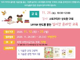 부모 대상으로 마련된 이번 교육은 스토리닥터 성숙향 대표의 ‘우리 아이 식습관을 돕는 그림책 놀이와 스토리텔링 육아법’이라는 주제로 진행되었으며, 이미지 메이킹을 활용한 단계별 식생활 교육과 그림책의 표지와 면지를 이용한 스토리텔링을 강조한 육아법 교육으로 부모와 자녀 간 상호작용을 기반으로 식습관 교육을 유도하고 본 교육에 활용한 식습관 교정 그림책과 식생활 관련 교육자료를 홍보물로 발송하여 스토리텔링 육아법에 실천하도록 하였다.