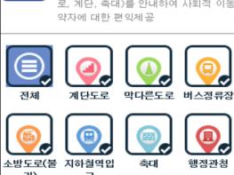 또 지도상에 ▲휠체어길 ▲버스 정류장, 지하철역 입구 등 대중교통시설 ▲계단, 막다른 도로 등 통행이 불편한 도로 정보를 테마 별로 선택해 표시할 수 있다.