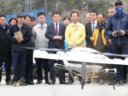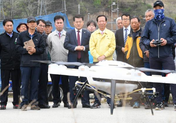 군은 2017년 국립원예특작과학원과 현장공동연구사업을 시작으로 드론 및 고속분무기를 활용한 사과 인공수분 실증 시험을 거쳐 드론 수정기술을 체계화했으며, 현재까지 사과농가 283호가 참여해 656.2ha의 면적에 ‘드론 및 고속분무기 활용 사과 인공수분 사업’을 추진 중이다.