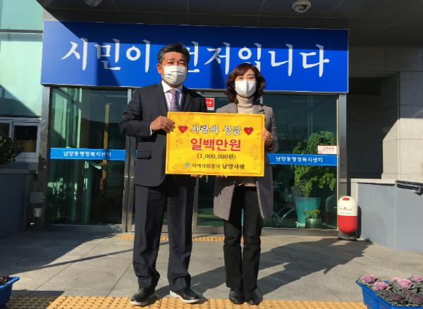 지역사회봉사 남양사랑(회장 조규성)은 지난 15일 연말연시 이웃돕기 성금 100만원을 남양동행정복지센터에 기탁하였다.