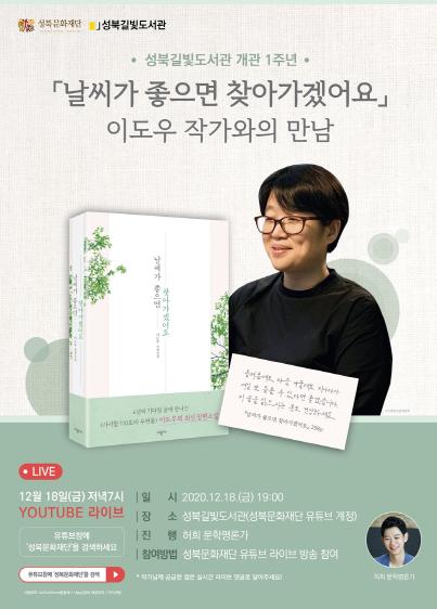 「날씨가 좋으면 찾아가겠어요」의 저자 이도우 작가와 함께하는 유튜브 라이브 방송은 성북문화재단 채널을 통해 방송한다. 실시간 댓글을 통해 작가와 독자의 현장감 넘치는 대화도 가능하다.