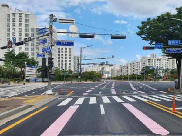 이 사업은 2020년 지역교통안전 환경개선사업의 하나로 추진하여 사업비 국고보조금 50%를 포함해 2억1천4백만원이 투입됐으며, 주요 개선사항은 횡단보도 및 신호기를 이설하여 교차로 면적을 축소하고, 과속?신호위반을 막기 위한 단속카메라 및 발광형 표지판 설치, 비정형 교차로의 운전자 시인성 향상을 위한 노면색깔 유도선 설치 등이다.