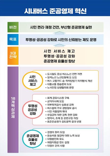 지난해 7월, 시가 부산형 시내버스 준공영제 혁신계획을 발표한 데 이어 이를 이행하기 위해 서비스 질 향상과 공공성 및 투명성, 효율성을 대폭 강화하는 내용을 담은 혁신안이 마련된 것이다.