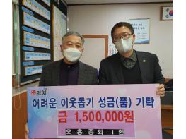 이웃돕기 성금 150만원은 연말연시 관내 어려운 저소득층을 지원하기 위한 것으로 그 중 50만원을 쾌척하신 오흥종 통장님은 평소에도 시정 및 동정을 적극 홍보하고 주민들을 위해 적극 봉사하시는 분으로 따스한 온정을 베푸는데 동참하여 주위의 귀감이 되고 있다.