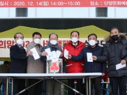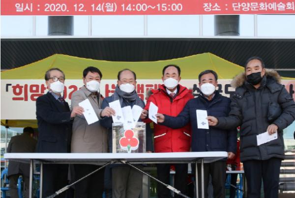 충북 단양군은 지난 14일 군청 현관 앞에서 ‘희망2021 나눔캠페인’의 군민 참여율 및 관심도 제고를 위한 ‘사랑의 온도탑 제막식’을 개최했다.
