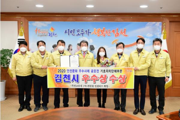 김천시는 행정안전부 주관 ‘2020 안전문화 우수사례공모전’에서 기초자치단체부문 우수상을 수상했다. 안전문화대상은 국민의 안전 의식과 안전문화운동 참여율을 높이기 위해 지자체, 공공기관, 민간 기업 등의 안전문화 우수사례를 발굴하여 시상하고 있다.