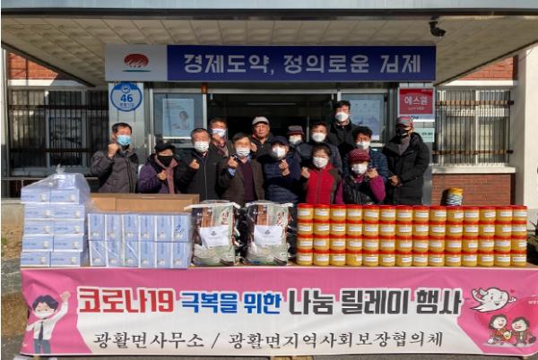 이 뜻깊은 행사에 동참하고자 관내 은파리 선광마을에 사는 이영수씨는 60만원 상당의 백미 200kg을 기탁하여 어려운 이웃 20여명에게 전달하였으며 지난번 지역 주민이 620만원 상당의 마스크를 기탁하여 이번 행사 때 광활면민 모두가 마스크를 착용할 수 있도록 각 마을 이장들에게 배부하였다.
