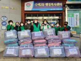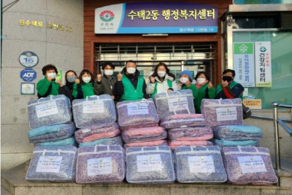 구리시에서는 12월 15일 연말연시를 맞이하여 수택2동 새마을지도자(회장 이웅재)와 새마을부녀회 주관으로 독거노인 등 저소득 주민에게 겨울 이불 26채를 전달하였다.