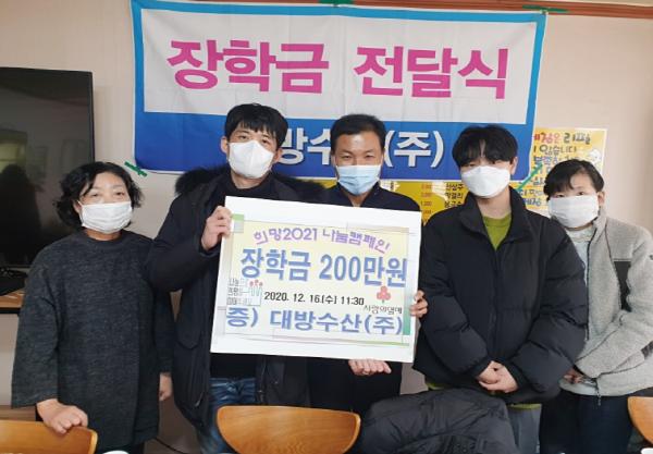 대방수산(주)에서는 4년째 지역 아동을 대상으로 오찬을 함께 하면서 장학금을 지원하였으나 올해는 코로나 19로 비대면으로 장학금 전달식을 진행하였다.