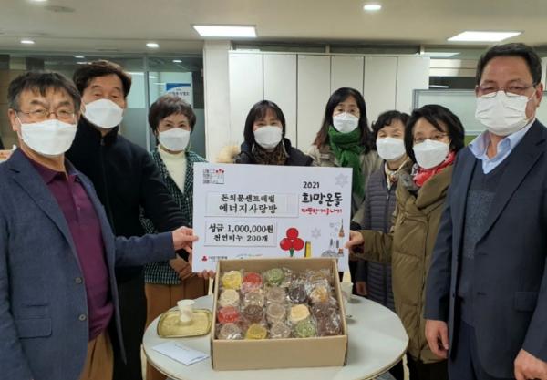 관내 천연동 돈의문센트레빌아파트의 에너지지킴이, 입주자대표회의, 부녀회는 그간 에너지 절약사례 강의 등을 통해 적립한 100만 원과 회원들이 직접 만든 천연비누 200장을 기부했다.