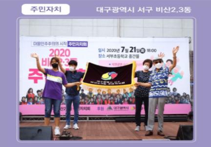 이번 우수사례 최종심사에서 비산2·3동 주민자치회는 대구지역 전체의 주민자치회 확산과 자치활동 동기부여에 기여한 것과 주민자치회 활동과 연계해 마을공동체만들기지원센터 등 다양한 기관과의 협력과 네트워크 구성이 잘 이루어진 점 등이 우수한 평가를 받았다.