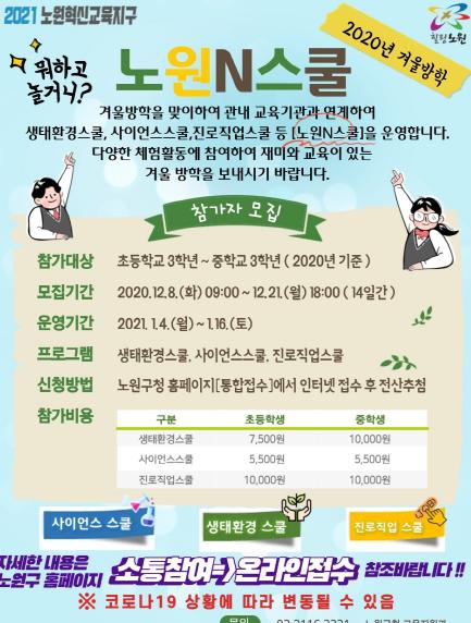 오승록 구청장은 “겨울방학 동안 청소년들이 관내 여러 교육시설에서 다양한 프로그램을 체험해 볼 수 있도록 구성한 ‘노원N스쿨’에 많은 관심과 참여 부탁드린다”며 “ 앞으로도 다양한 교육프로그램 제공을 위해 노력하겠다‘고 말했다.