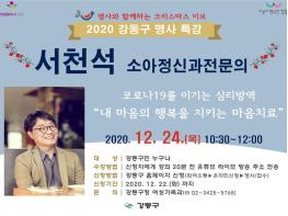 강동구가 12월 24일 행복한아이연구소 소장 서천석 박사를 초청해 ‘내 마음의 행복을 지키는 마음치료’라는 주제로 온라인 특강을 진행한다.