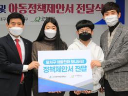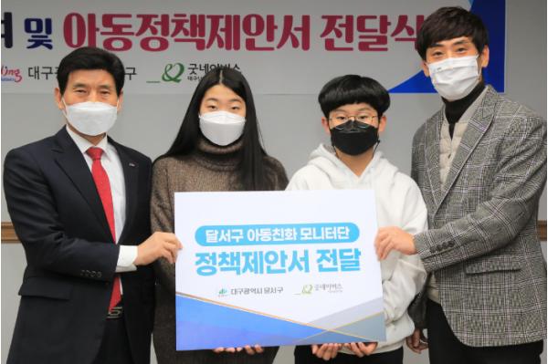 대구 달서구는 제1기 달서구 아동친화모니터단과 굿네이버스 대구남부지부(안정하 지부장)에서 지난 15일 아동친화모니터단원들이 제안하고 선정한 정책제안서를 달서구에 전달하였다고 밝혔다.