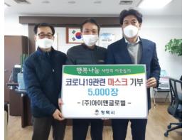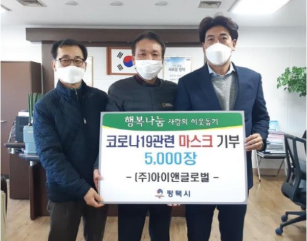 평택시 청북읍 소재 (주)아이앤글로벌은 지난 16일 평택시 송탄출장소를 방문해 코로나19 확산 예방을 위해 써달라며 KF94 마스크 5,000장을 전달했다.