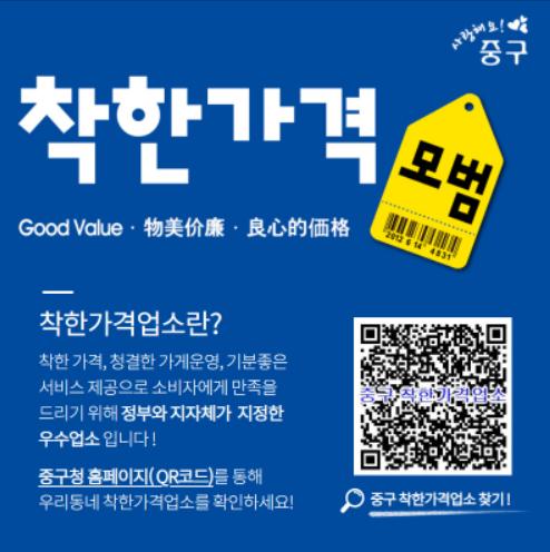 착한가격업소는 경기침체?물가인상 등 어려운 상황 속에서도 소비자에게 저렴한 상품과 양질의 서비스를 제공하는 업소로, 가격, 위생, 서비스 등을 기준으로 엄선해 선정된다. 착한가격업소로 지정된 업체는 중구 홈페이지에서 확인할 수 있다.