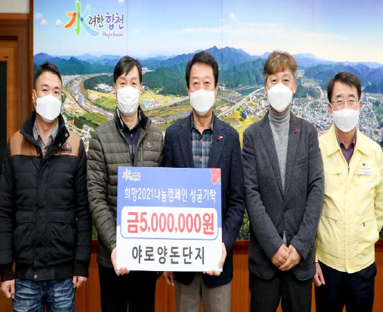 합천군 야로양돈단지(회장 박상진)는 17일 합천군청을 방문하여 이웃돕기 성금 500만원을 기탁했다.