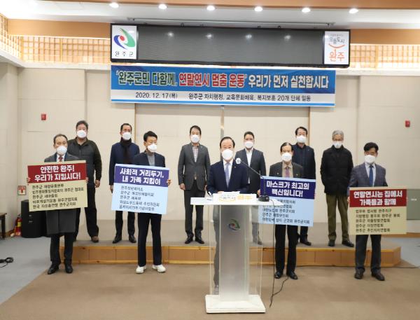 완주군 애향운동본부와 민주평화통일자문회의 완주군협의회, 완주군 새마을회, 바르게살기협의회 완주군협의회 등 완주지역 20개 민간단체들은 17일 오전 11시 군청 대회의실에서 ‘코로나19 위기 극복과 조기 종식을 위한 군민 다함께 연말연시 멈춤 운동’ 추진과 관련한 기자회견을 가졌다.